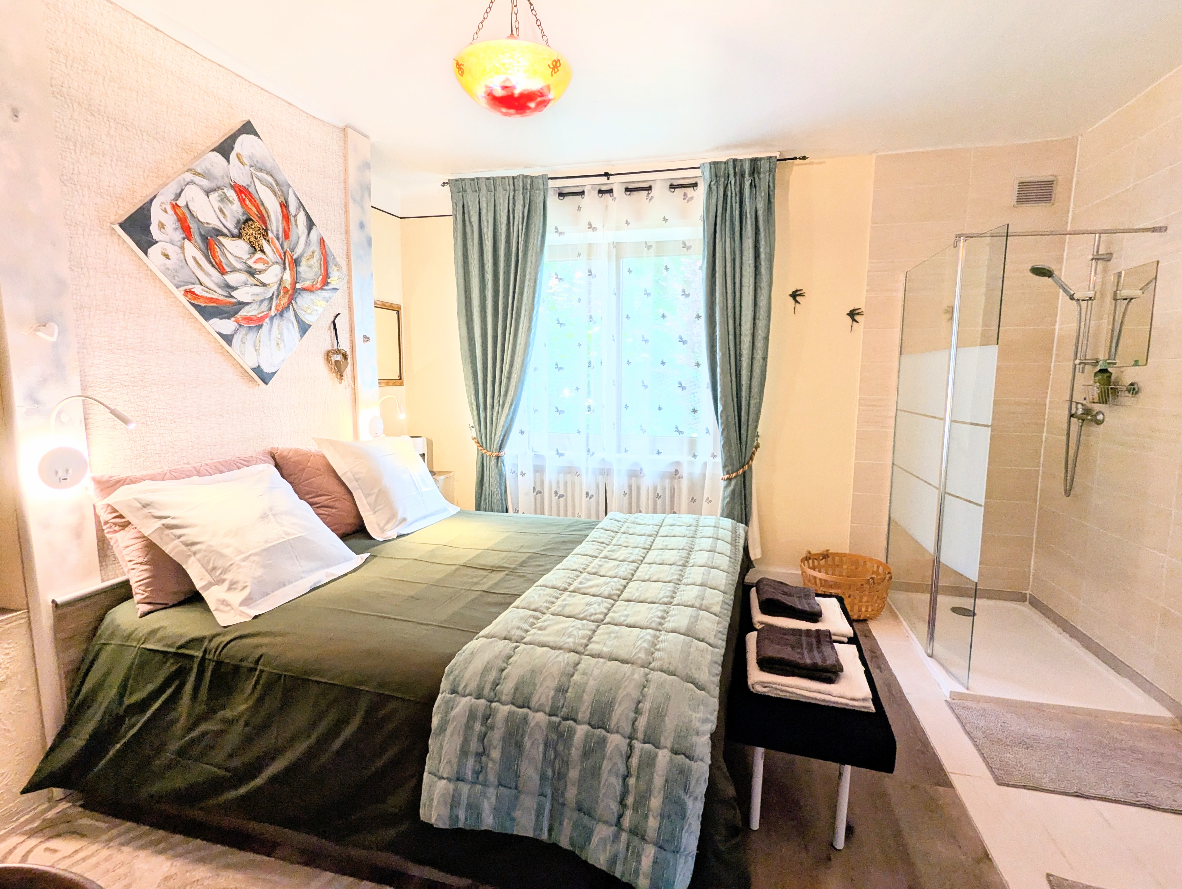 - 1 Zimmer mit einem großen Bett für 2 Personen : 75 €.